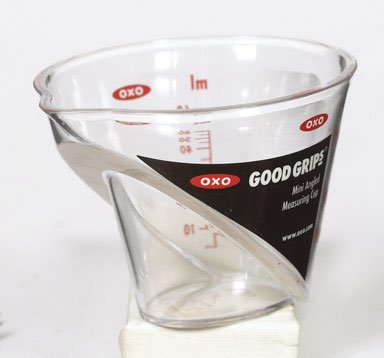 So, I use an antique cough syrup glass. The measurements are all debossed in the glass and won’t ever wear off. And, it measures in tiny increments up to two tablespoons/one ounce. If you can’t find one (check eBay) I have friends who use the OXO Good Grips 1/4 cup angled measuring cup. It does the job very well, is readily available, and is easy to read while it sits on the counter. Handy indeed.